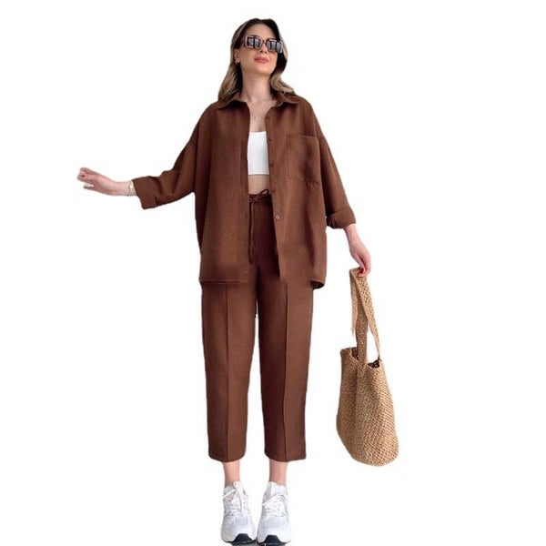 Entdecken Sie unser stilvolles Damen Haremshose und Oberteil Set, das speziell für modebewusste Frauen in großen Größen entworfen wurde. Dieses zweiteilige Set kombiniert eine lässige, lockere Hemdjacke mit einer modischen Neun-Punkt-Sport-Haremshose, die nicht nur bequem, sondern auch äußerst vielseitig ist. Die verkürzte Hose sorgt für einen modernen Look, während die langen Ärmel der Hemdjacke Eleganz und Stil verleihen. Hergestellt aus hochwertigem Polyester, bietet dieses Ensemble nicht nur eine angenehme Passform, sondern auch eine hervorragende Atmungsaktivität. Wählen Sie aus einer Palette von trendigen Farben wie Aprikose, Orangerot, Schwarz, Grün und Dunkelbraun, um Ihren persönlichen Stil zu unterstreichen. Erhältlich in den Größen S bis 2XL, ist dieses Set die perfekte Wahl für jeden Anlass, sei es ein entspannter Tag zu Hause oder ein Ausflug mit Freunden. Gönnen Sie sich diesen modischen Hosenanzug und fühlen Sie sich in jeder Situation wohl und selbstbewusst!