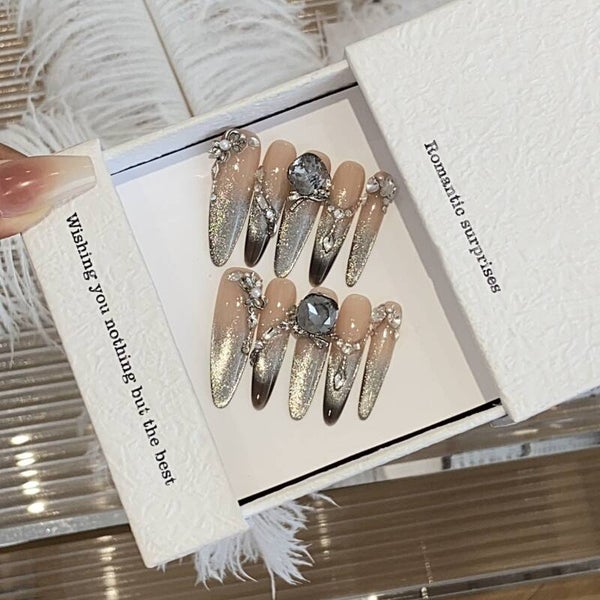 Entdecken Sie die handgemachten Aufsetznägel im französischen Katzenaugen-Stil, die Ihrem Look einen Hauch von leichtem Luxus verleihen. Diese exquisiten Nägel in den Farben Pfirsichschwarz und schwarzer Schokolade sind mit einem quadratischen Diamanten und blitzender Seitenbeleuchtung versehen, die für einen atemberaubenden Glanz sorgen. Ideal für festliche Anlässe oder um Ihrem Alltagslook eine süße Note zu verleihen, kombinieren sie chinesischen Stil mit einem ultradünnen, spurlosen Design, das sich nahtlos an Ihre Nägel anpasst. Die zarten Motive wie Blumen, Herzen und Schmetterlinge bringen eine verspielte Eleganz in Ihr Nageldesign. Erhältlich in den Größen XS, S, M und L, können Sie die perfekte Passform für Ihre Nägel auswählen. Gönnen Sie sich diesen luxuriösen Nageltrend und lassen Sie Ihre Hände strahlen!