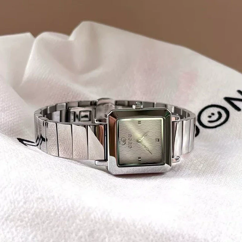 Elegante Quarzuhr für Damen mit eckigem Zifferblatt und Stahlarmband im „Small Luxe“-Chanel-Stil
