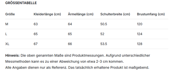 Hinweis zu den Maßen: Bitte beachten Sie die separate Größentabelle. Alle Maßangaben können aufgrund unterschiedlicher Messmethoden um 1-3 cm abweichen.