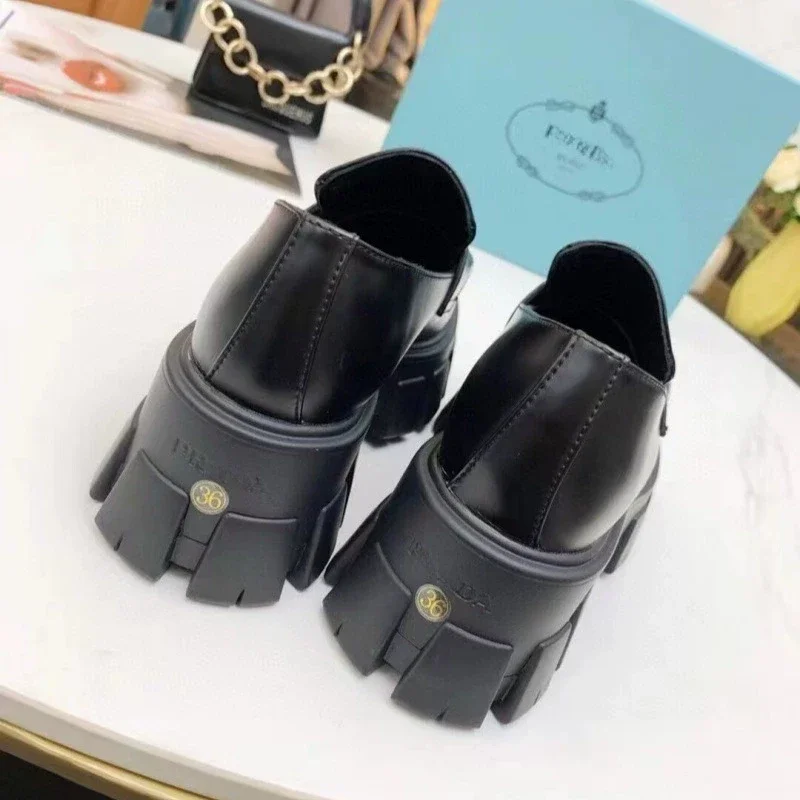 Entdecken Sie die Prada Monolith Loafer – Mokassins, die den perfekten Mix aus Eleganz und Komfort bieten. Diese Damen-Leder-Loafer zeichnen sich durch ihre runde Spitze und den markanten Blockabsatz aus, der mit einer Plateau-Sohle kombiniert ist, um Ihnen nicht nur einen Hauch von Höhe, sondern auch unvergleichlichen Komfort zu verleihen. Hergestellt aus hochwertigem Rindleder und gefüttert mit luxuriösem Lammleder, bieten diese Schuhe ein angenehmes Tragegefühl, das den ganzen Tag anhält. Die EVA-Sohle sorgt für Leichtigkeit und Flexibilität, während die flach ausgeschnittene Ausschnittform und die niedrige Schafthöhe einen modernen, lässigen Look kreieren. Erhältlich in verschiedenen Ausführungen – von mattem über glänzendes bis hin zu Premium Schwarz – und in den Größen 35 bis 40, sind diese Loafer die ideale Wahl für stilbewusste Frauen, die sowohl im Alltag als auch zu besonderen Anlässen glänzen möchten. Gönnen Sie sich diesen zeitlosen Klassiker und setzen Sie ein modisches Statement!